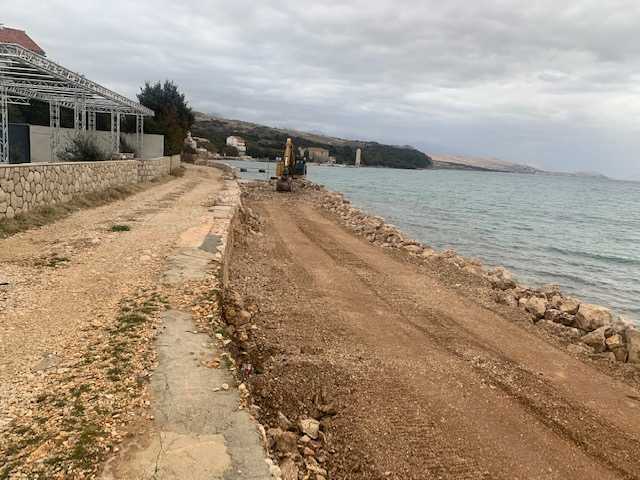 U sklopu projekta Poboljšanje vodno – komunalne infrastrukture aglomeracija Novalja na radovima „Dogradnja sustava sanitarne odvodnje u neselju Caska” na kolektoru C1-3 trenutno se izvode radovi nasipavanja privremenog operativnog puta koji će nakon izvedenog obuhvata na predmetnom kolektoru biti uklonjen.